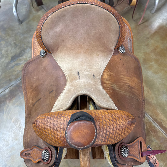7/8 Tool Basket Stamp, Border Tooled, Roughout Jockey and Fender, Toast Suede Seat, Rawhide Covered Stirrups