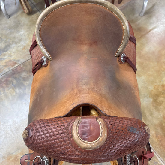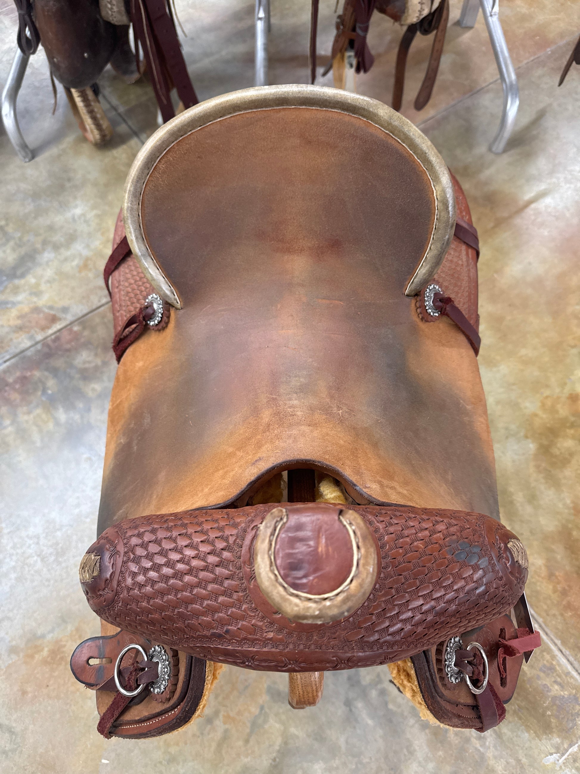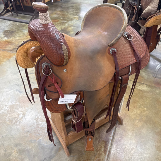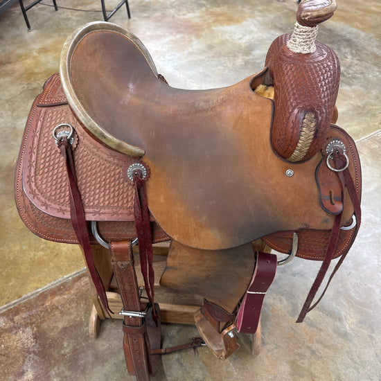 1/2 Tool Basket Stamp, Barbwire Border, Hard Seat, Roughout Seat/Jockey/Fender, Rawhide Pencil Roll, Rawhide Laced Swell Caps, Saddle Strings, Wood Stirrups