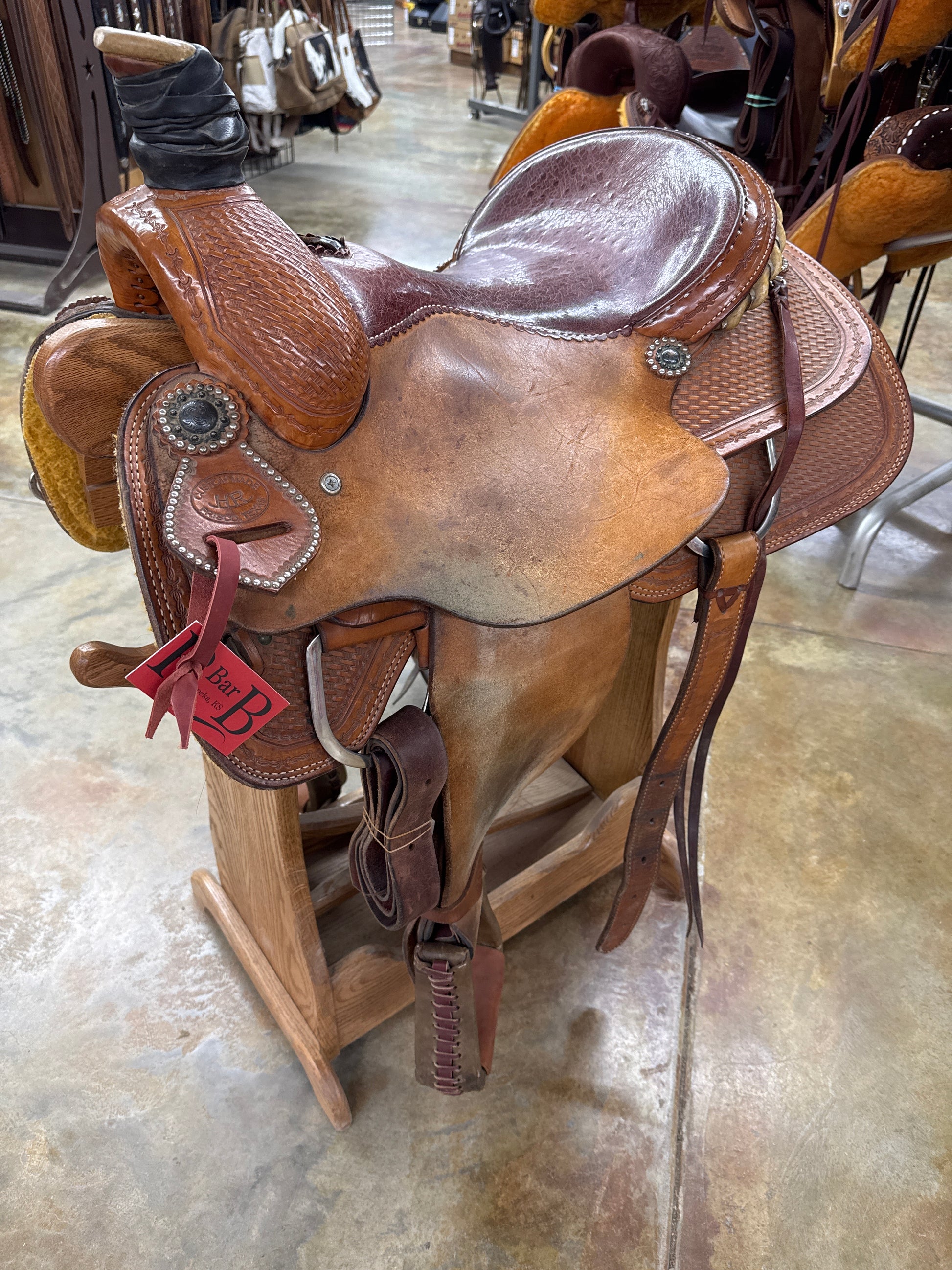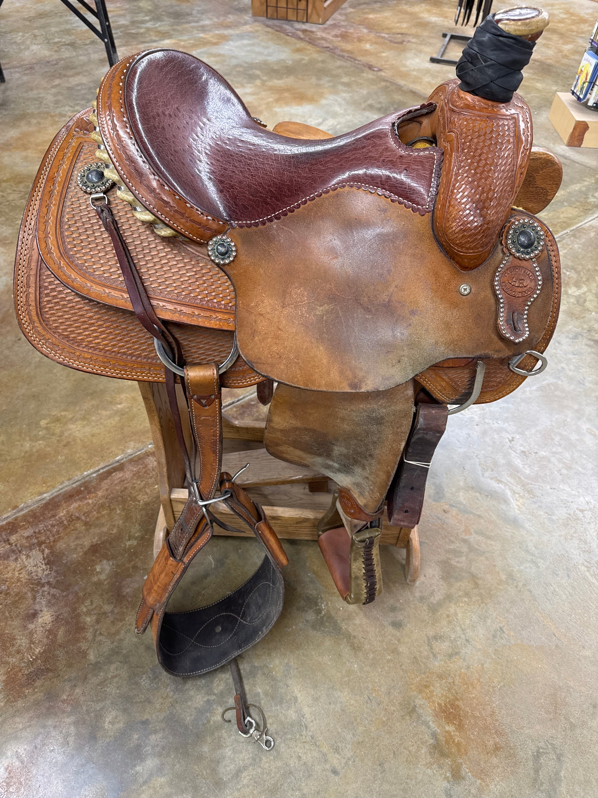 1/2 Tool Basket Stamp, Barbwire Border, Rasberry Ostrich Seat, Rawhide Silver Laced Cantle, Latigo Rear Strings, Rawhide Covered Stirrups