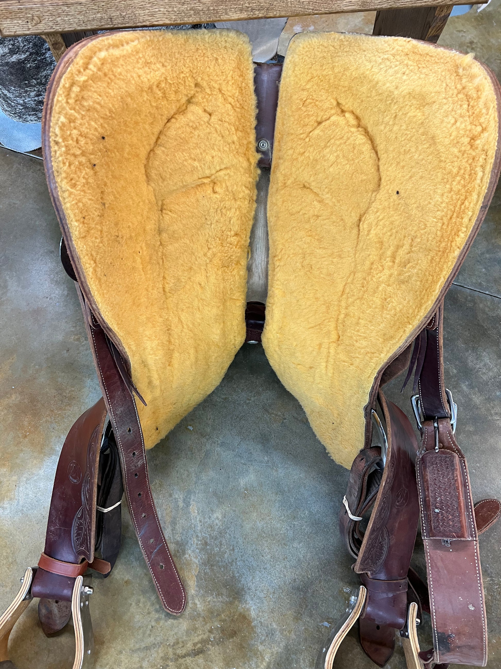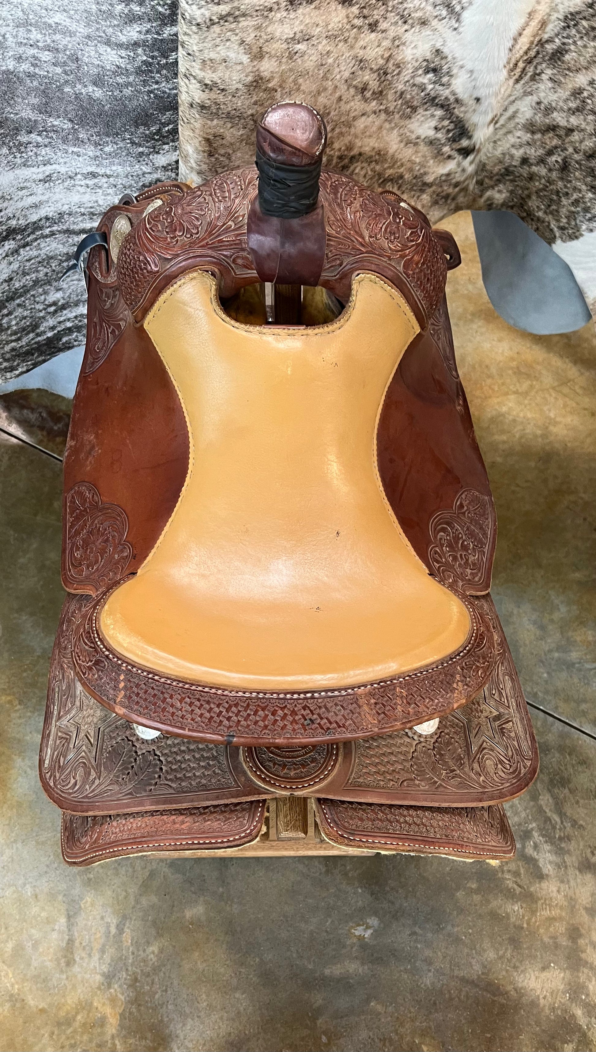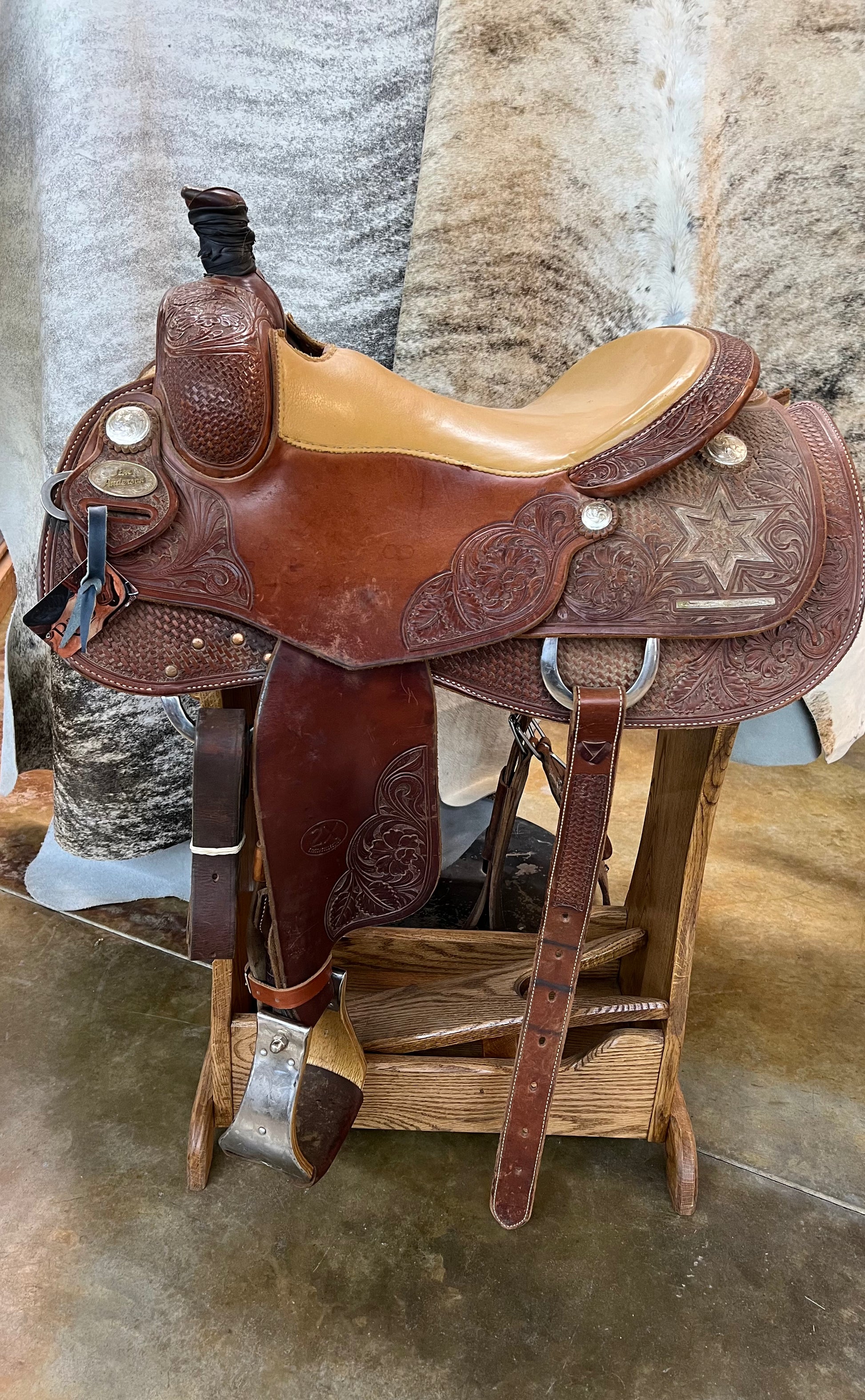 3/4 Tool combo, tan grainout seat, stainless wrapped monel style stirrups