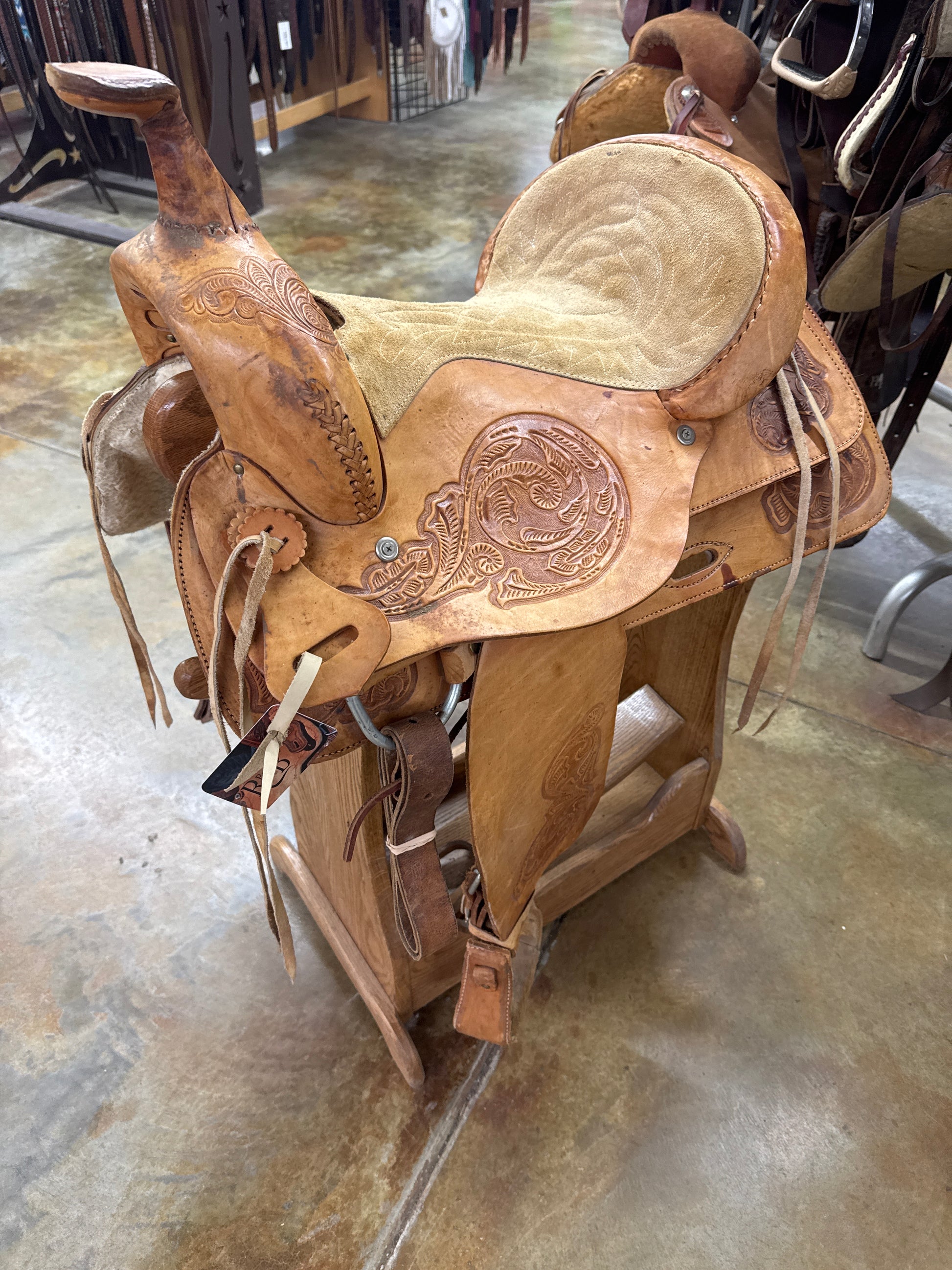 Smoothout Leather, Spot Tooled, Tan Suede Stitched Seat, Saddle Strings, Leather CoveredĀ Stirrups.