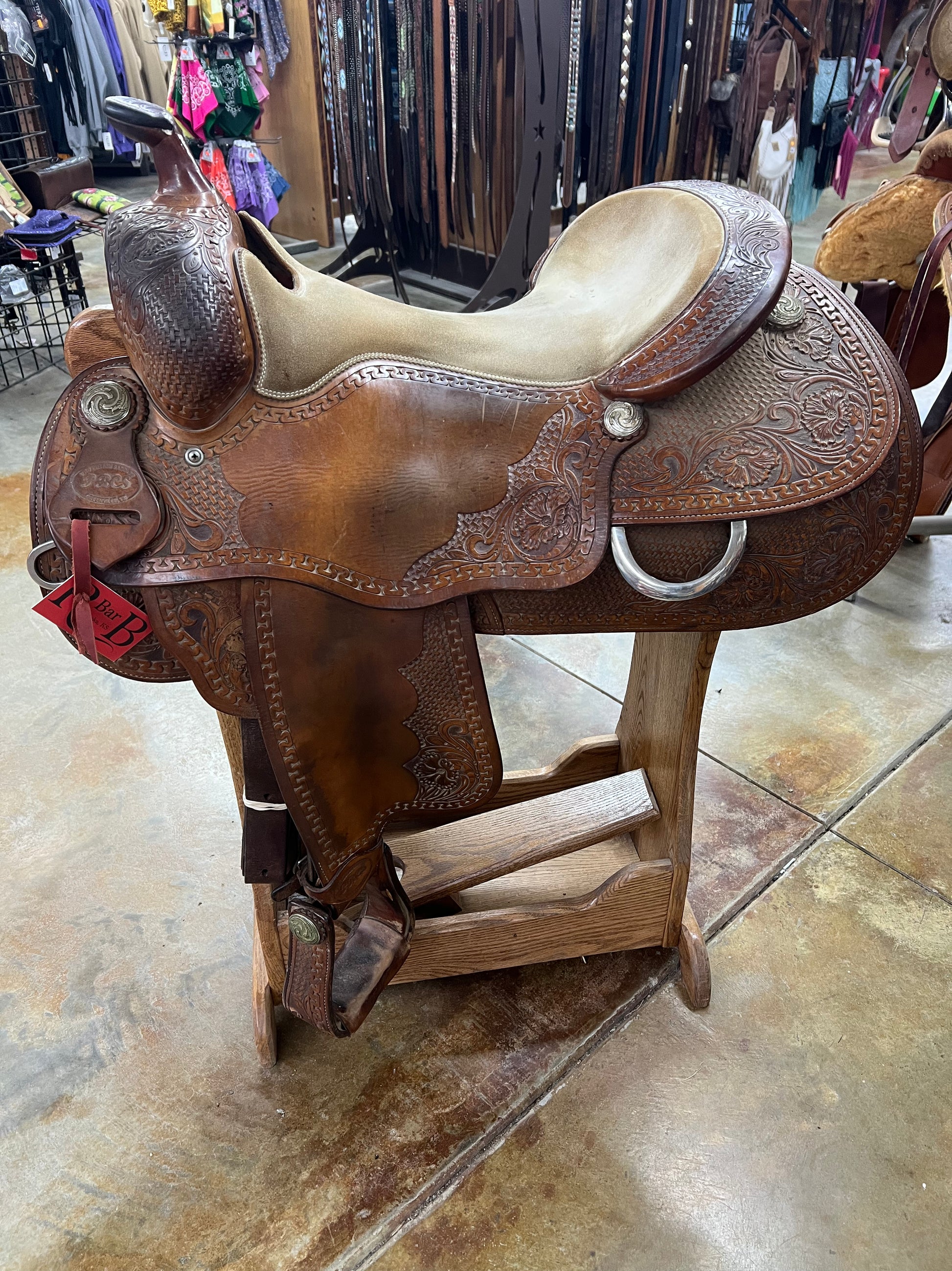 3/4 Tool Combo Tool, Running W Border, Smoothout Leather, Tan Suede Padded Seat, Cheyenne Roll, Tooled Leather Covered Stirrups