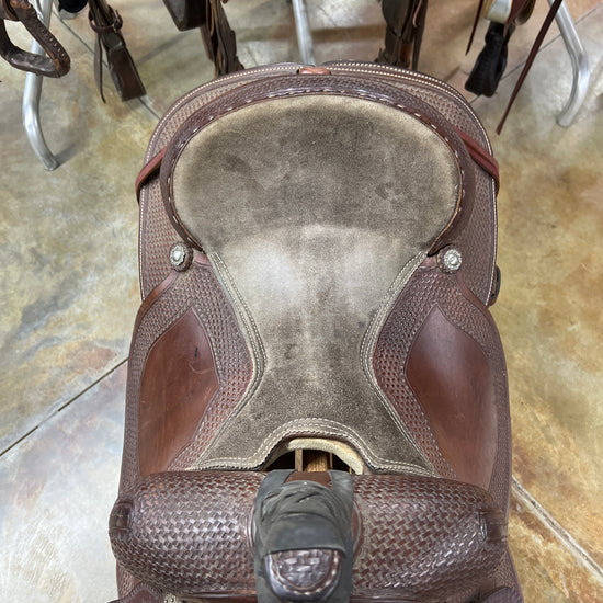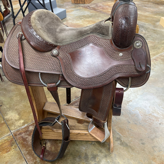 7/8 Basket Stamp, Chocolate Leather, Chocolate Suede Seat, Cheyenne Roll, Rear Saddle Strings, Aluminum Stirrups