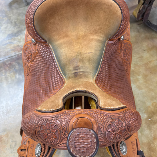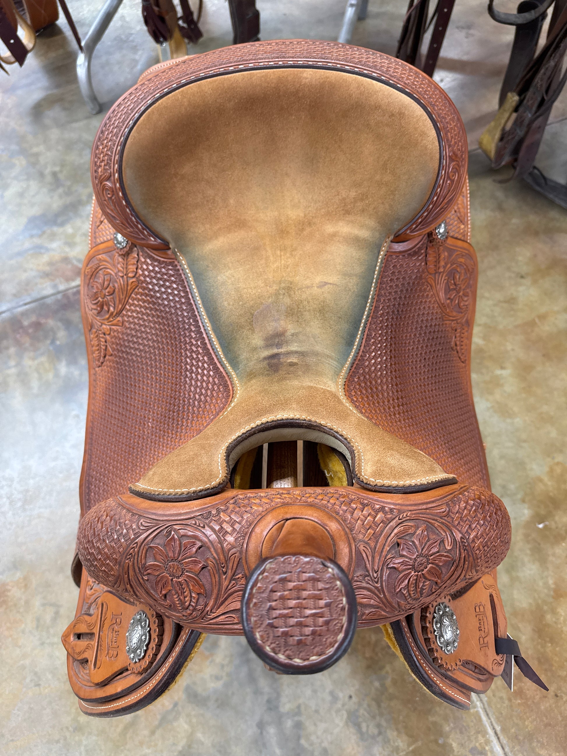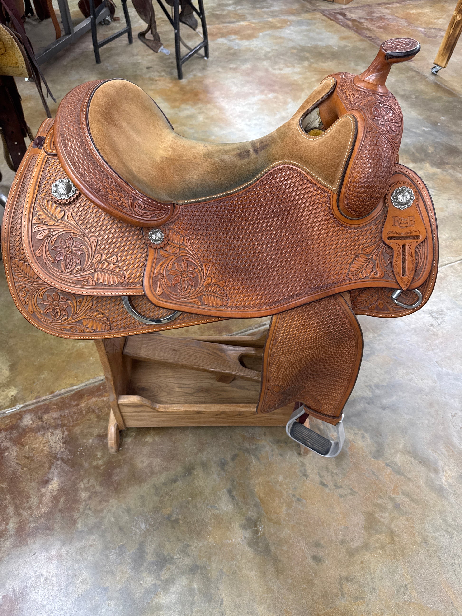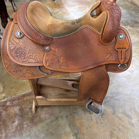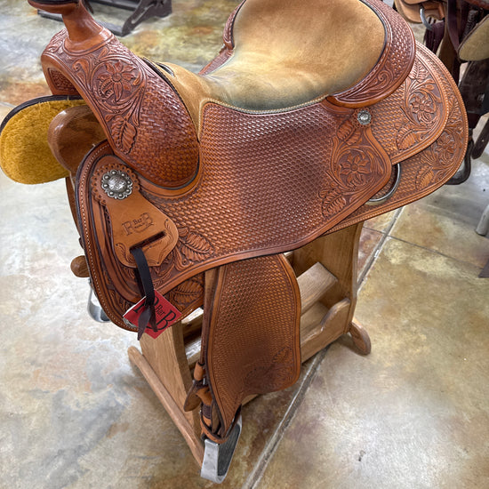 Fully Tooled Combo Basket Stamp/Floral, Toast Suede Seat, Cheyenne Roll, Aluminum Stirrups