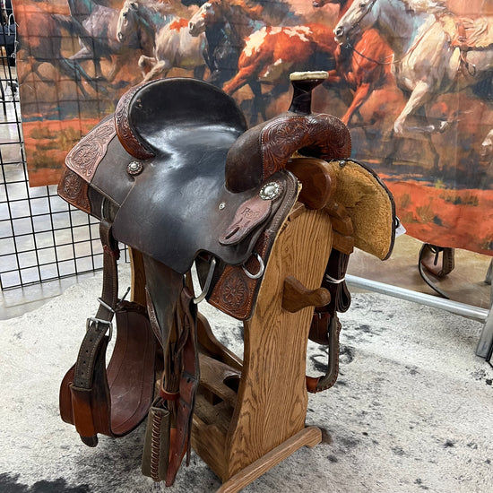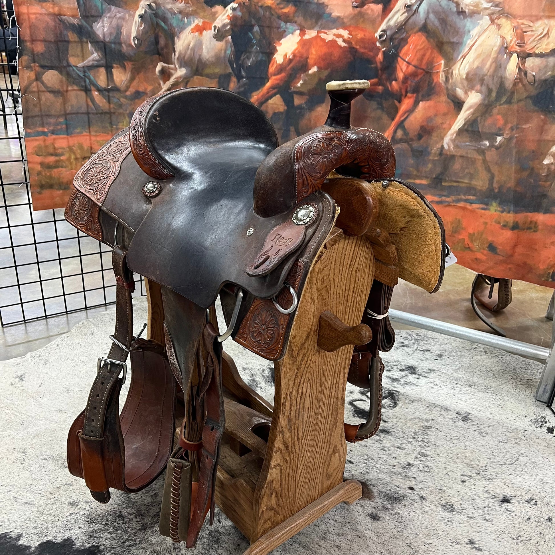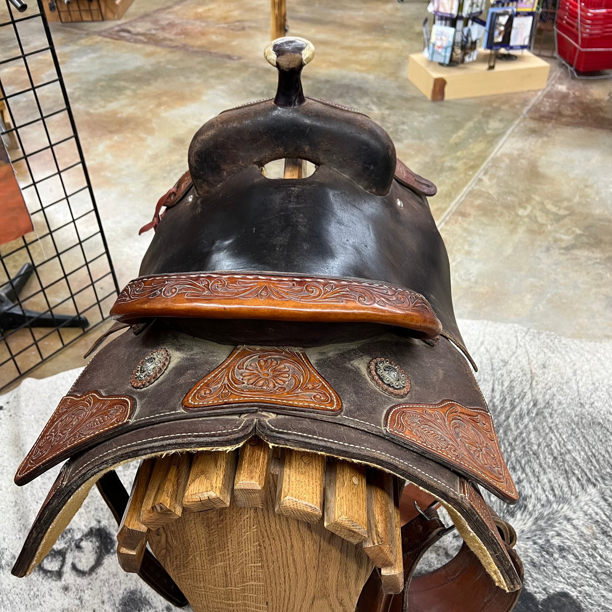 Chocolate Roughout Leather, Floral Tooled/Overlayed Corners, Hard Seat, Cheyenne Roll, Rawhide Covered/Laced Stirrups