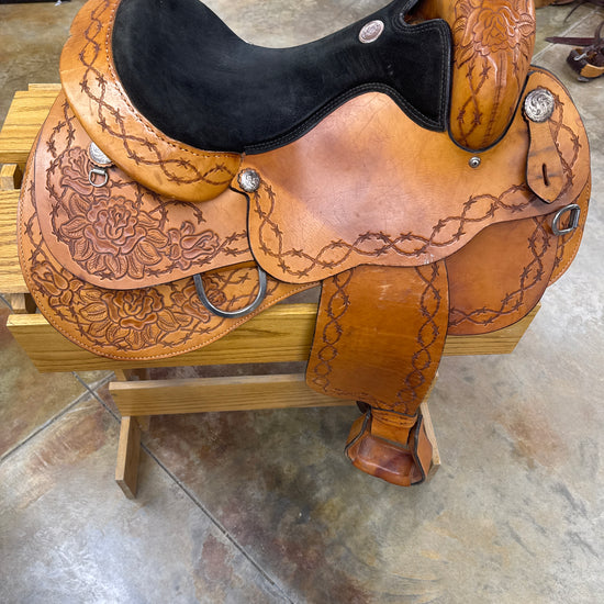 Smoothout Leather, Floral Tooled Corners, Woven Barbwire Border, Full Black Suede Seat, Leather Covered Stirrups