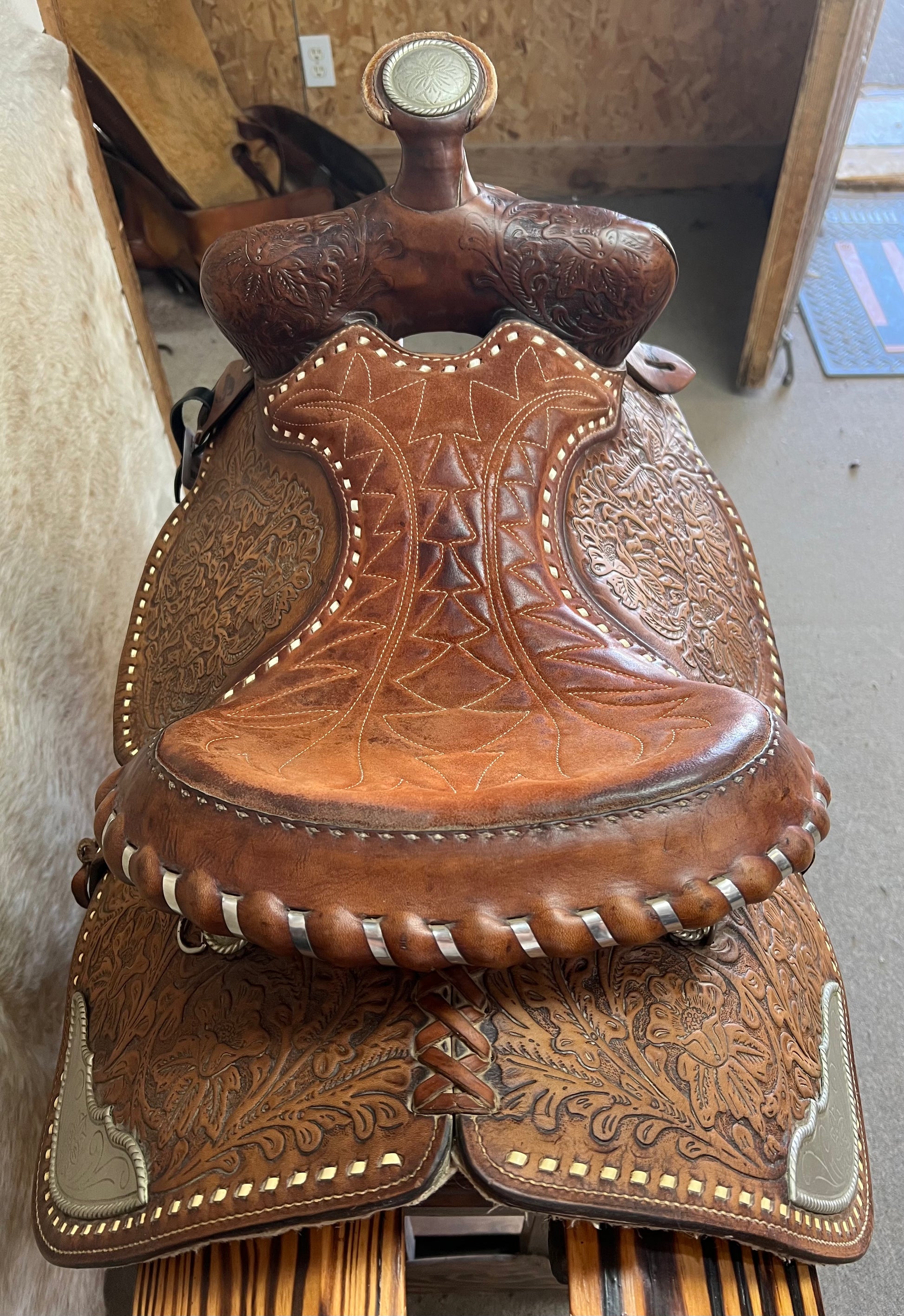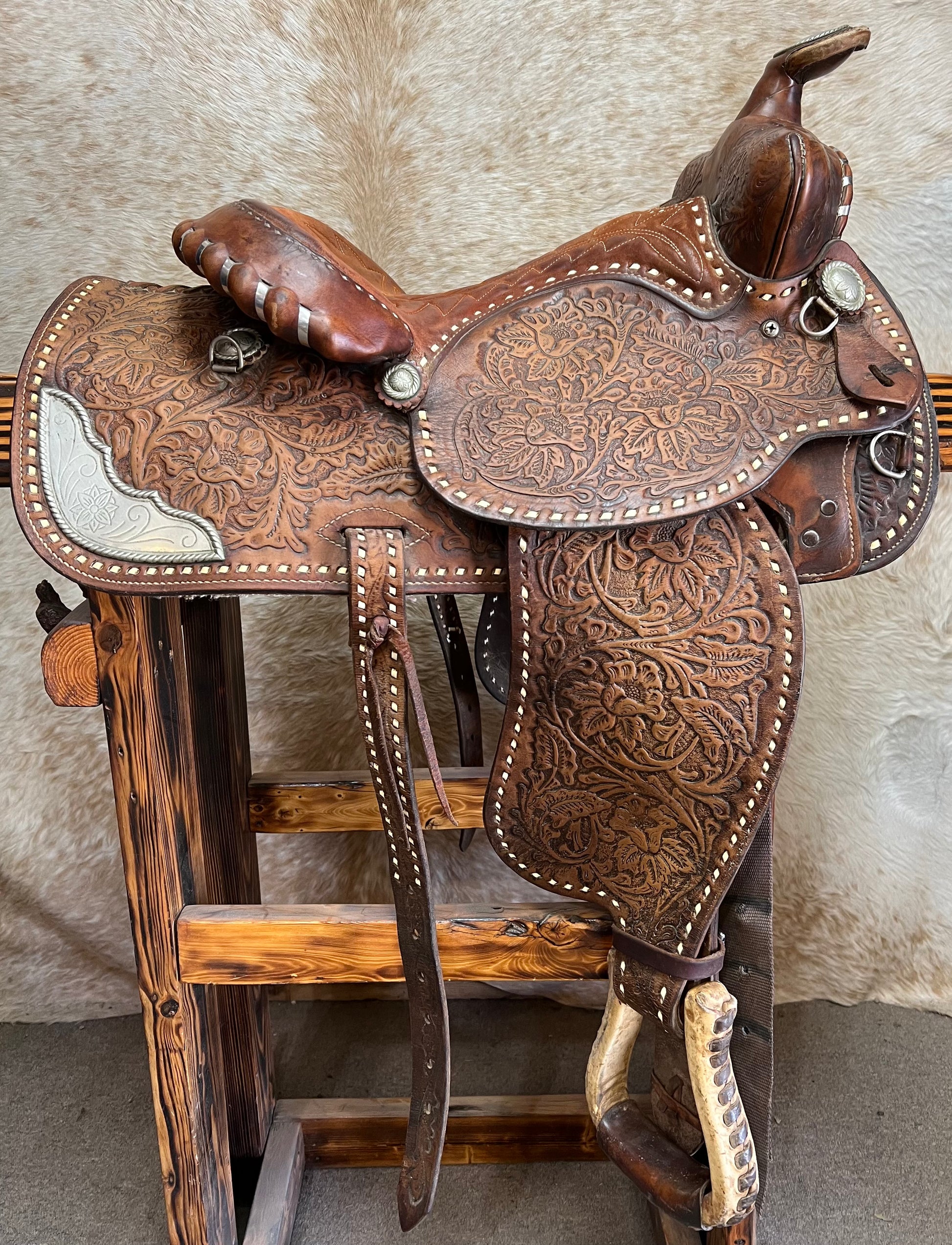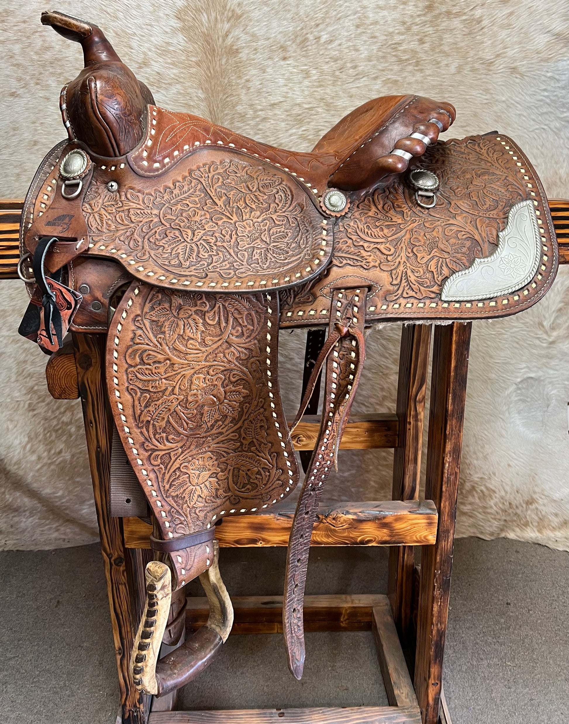Full Tool Floral, Buckstitched, Silver Corners, Rust Suede Seat