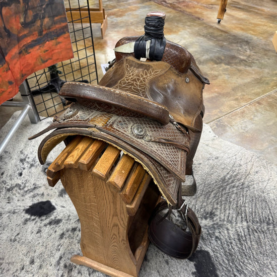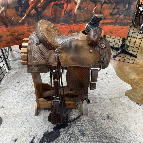 7/8 Tool Spider Stamp, Barbwire Border, Brown Suede Quilted Seat, Roughout Jockey, Rear Saddle Strings, Aluminum Slanted Stirrups