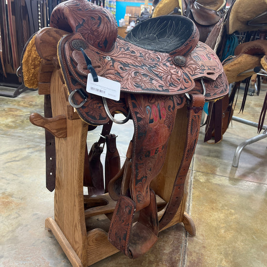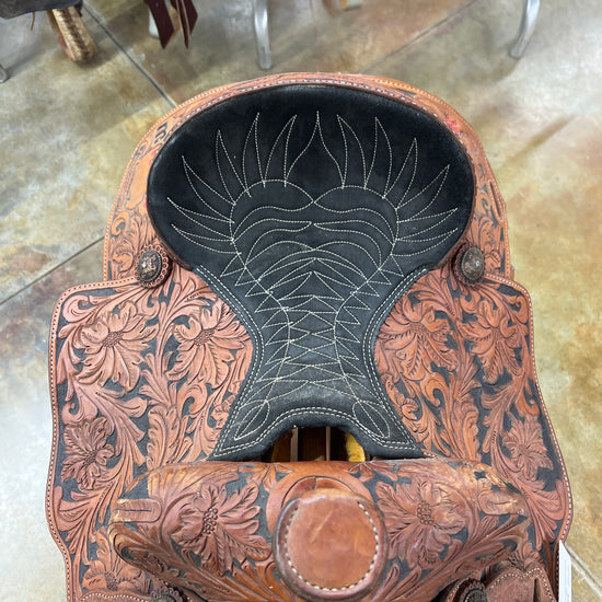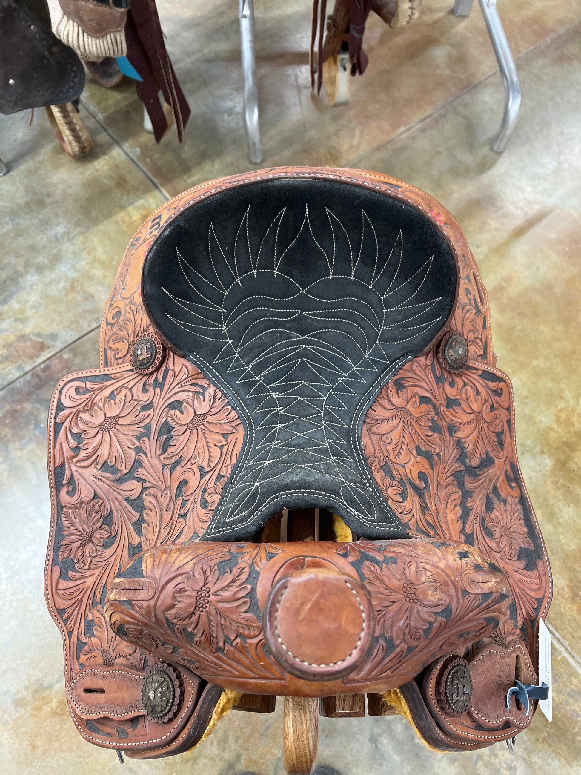 Full Tooled Floral, Black Dyed Background, Black Suede Stitched Seat, Tooled Leather Covered Stirrups.