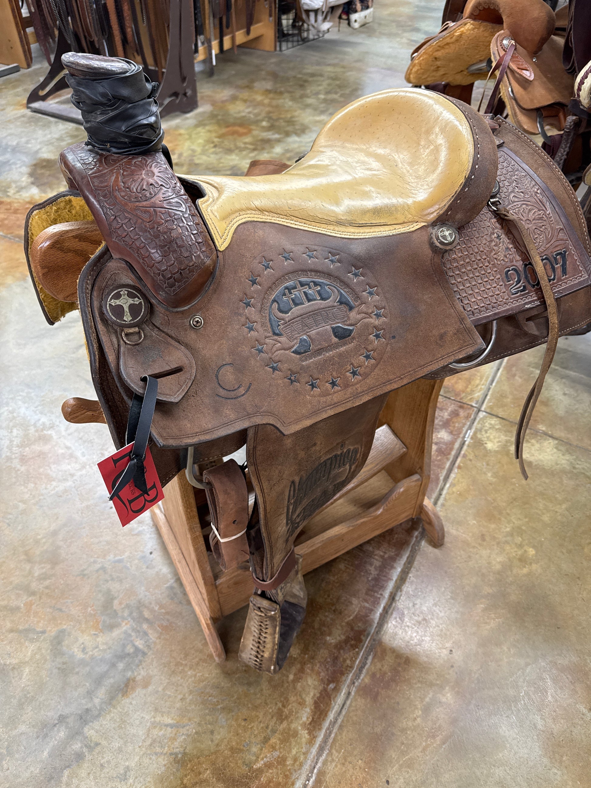 1/2 Tool Combo Tool, Roughout Jockey and Fender, Tan Faux Ostrich Seat, Rear Saddle Strings, Rawhide Covered Roper Stirrups