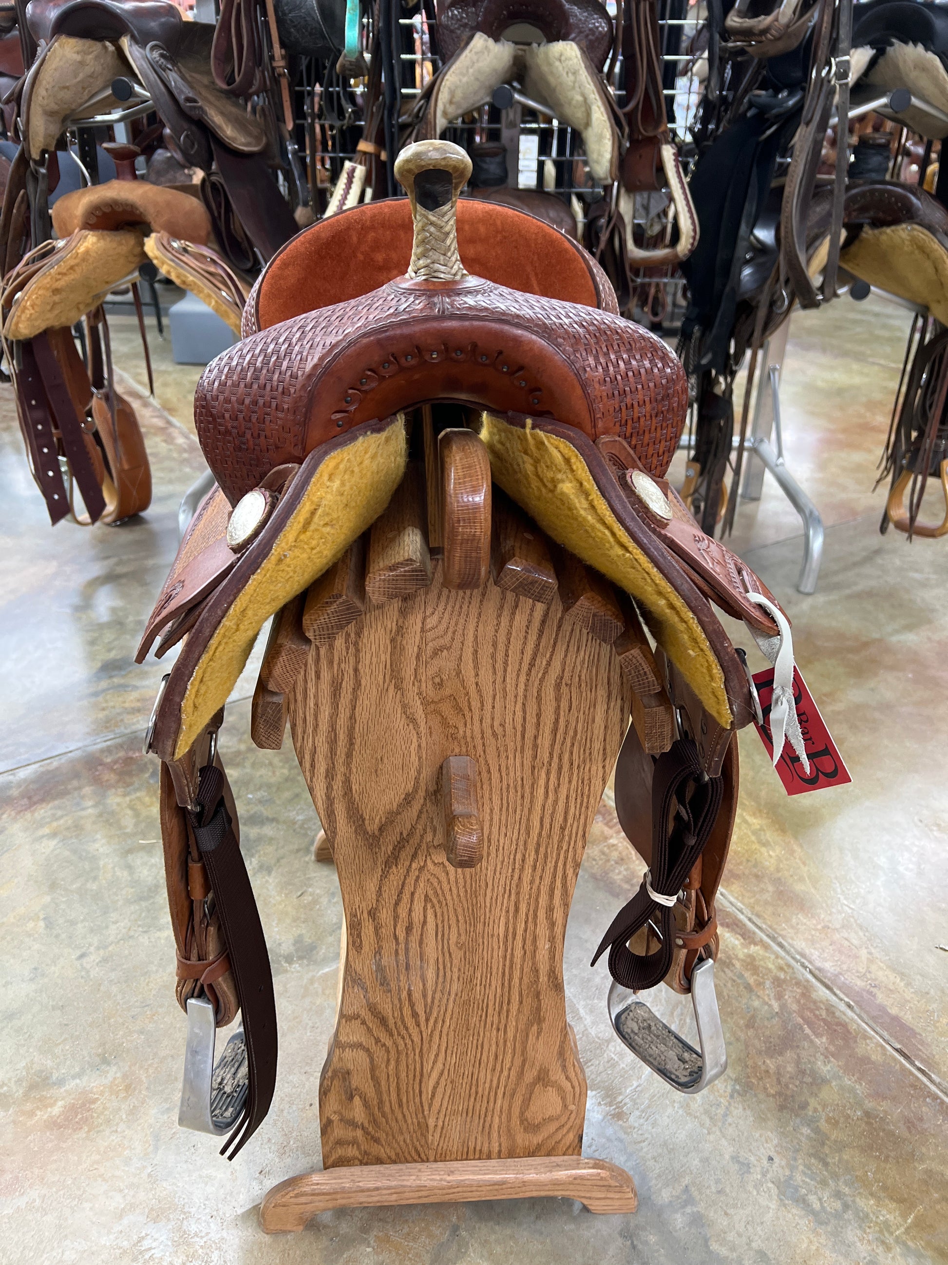 Basket Stamp, Roughout Fenders, Rust Suede Inlaid Seat, Rawhide Silver Laced Cantle, Rawhide Braided Horn, Aluminum Barrel Stirrups
