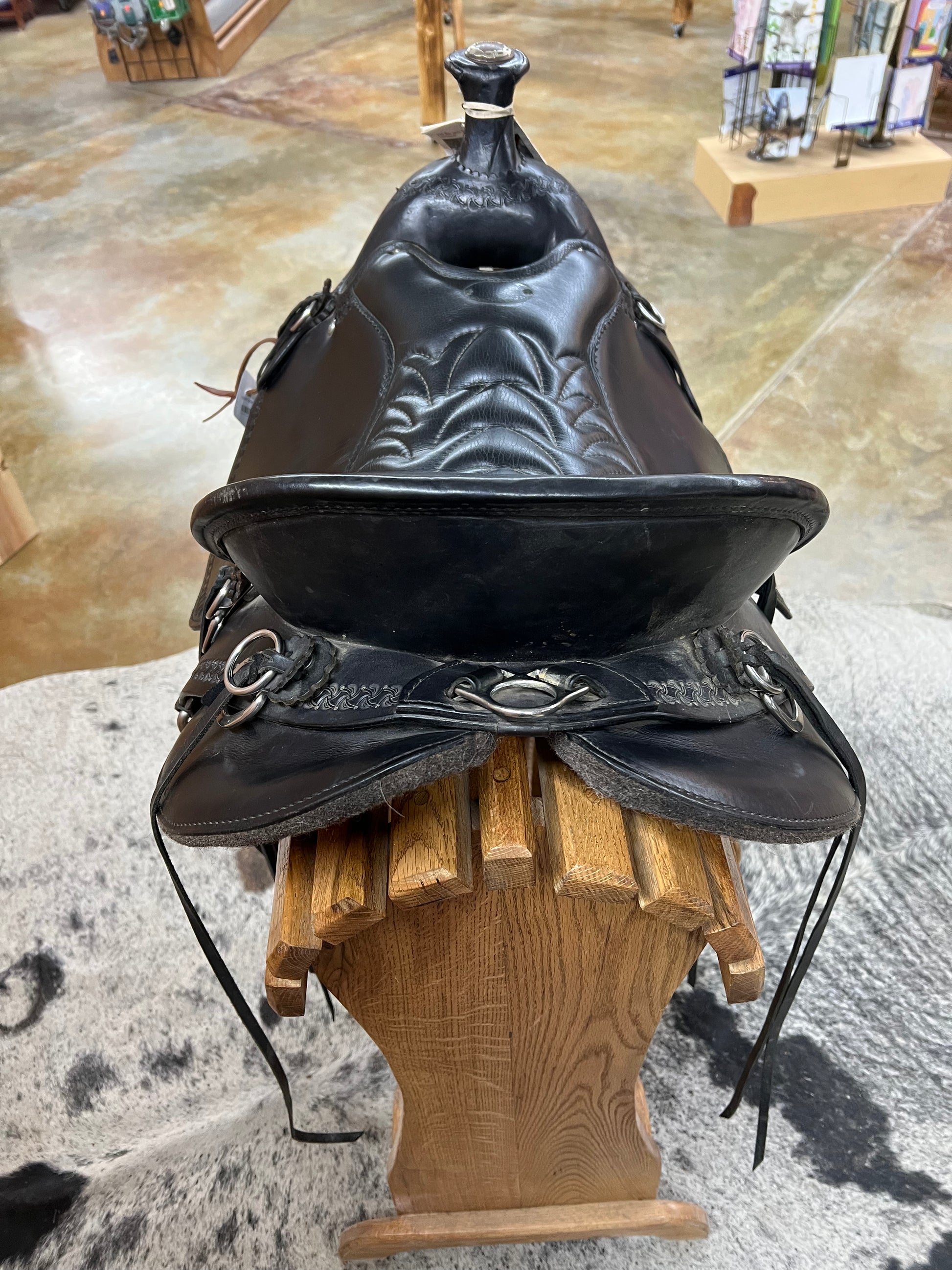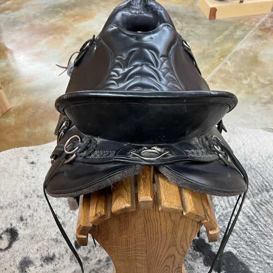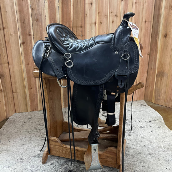 Black Smoothout Leather, Border Tool, Black Grainout Quilted Seat, Stainless Hardware, Saddle Strings, Wood Metal Bound Stirrups.