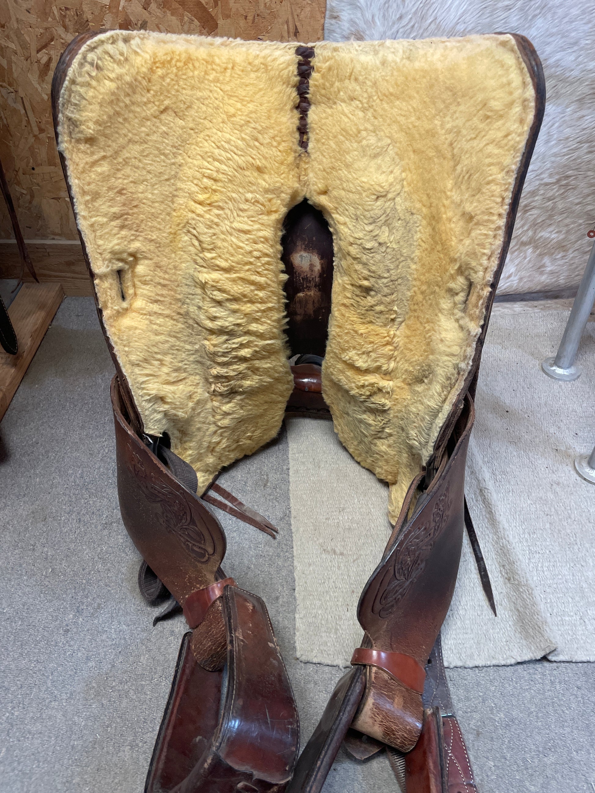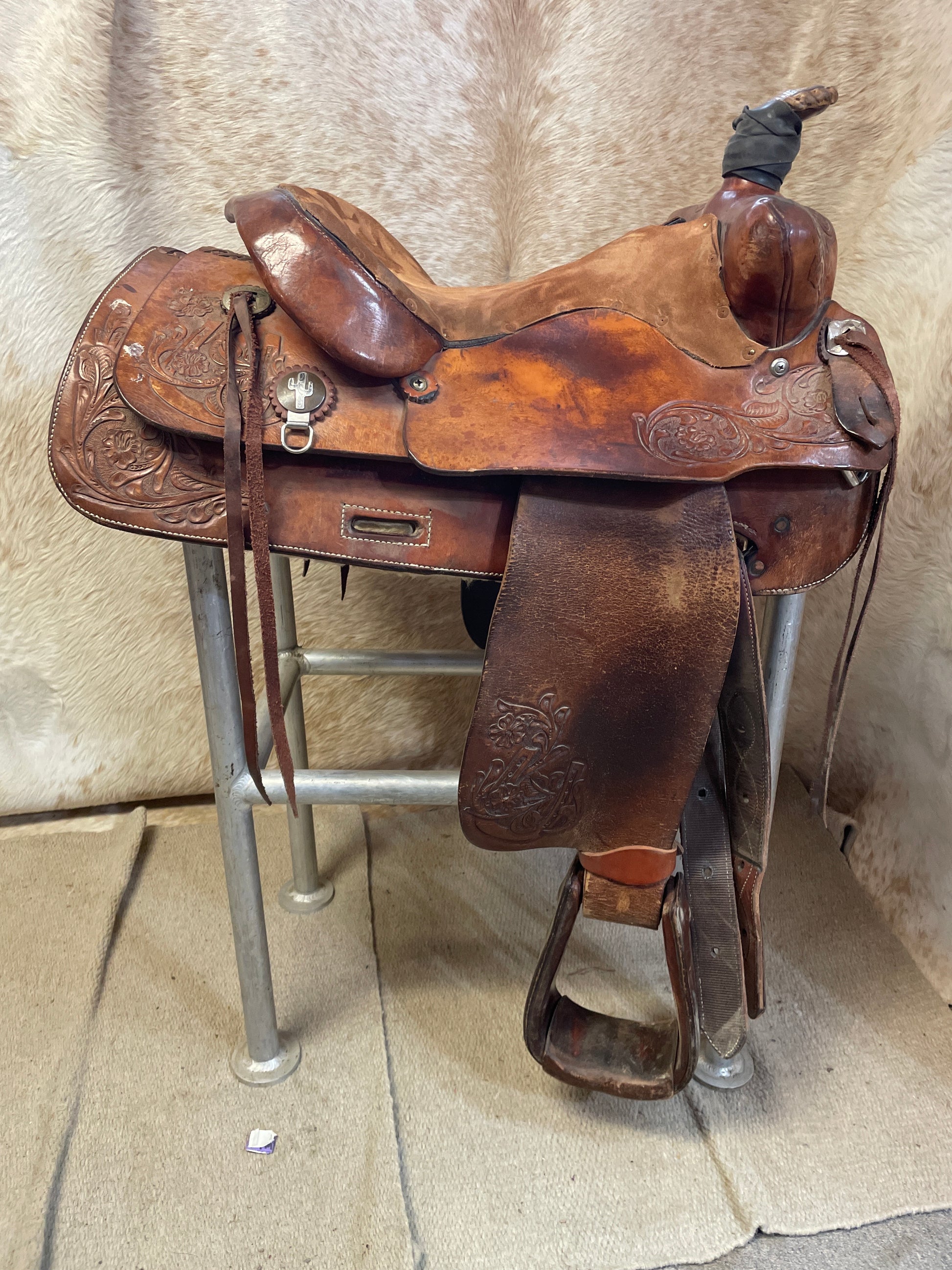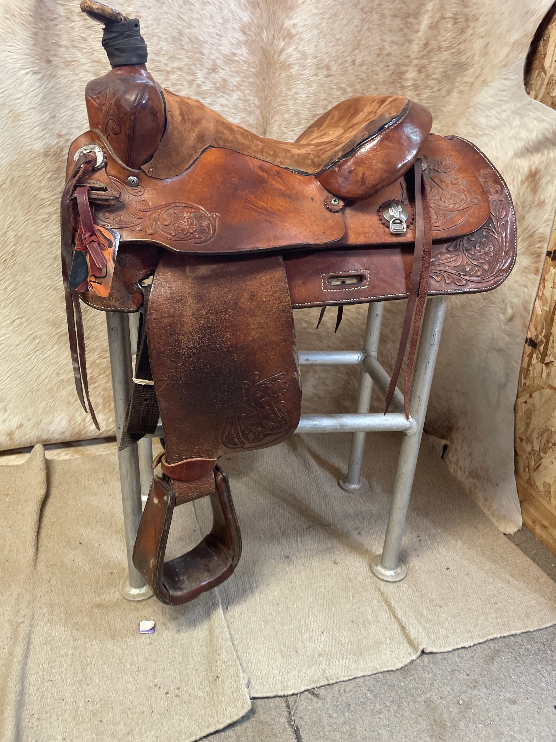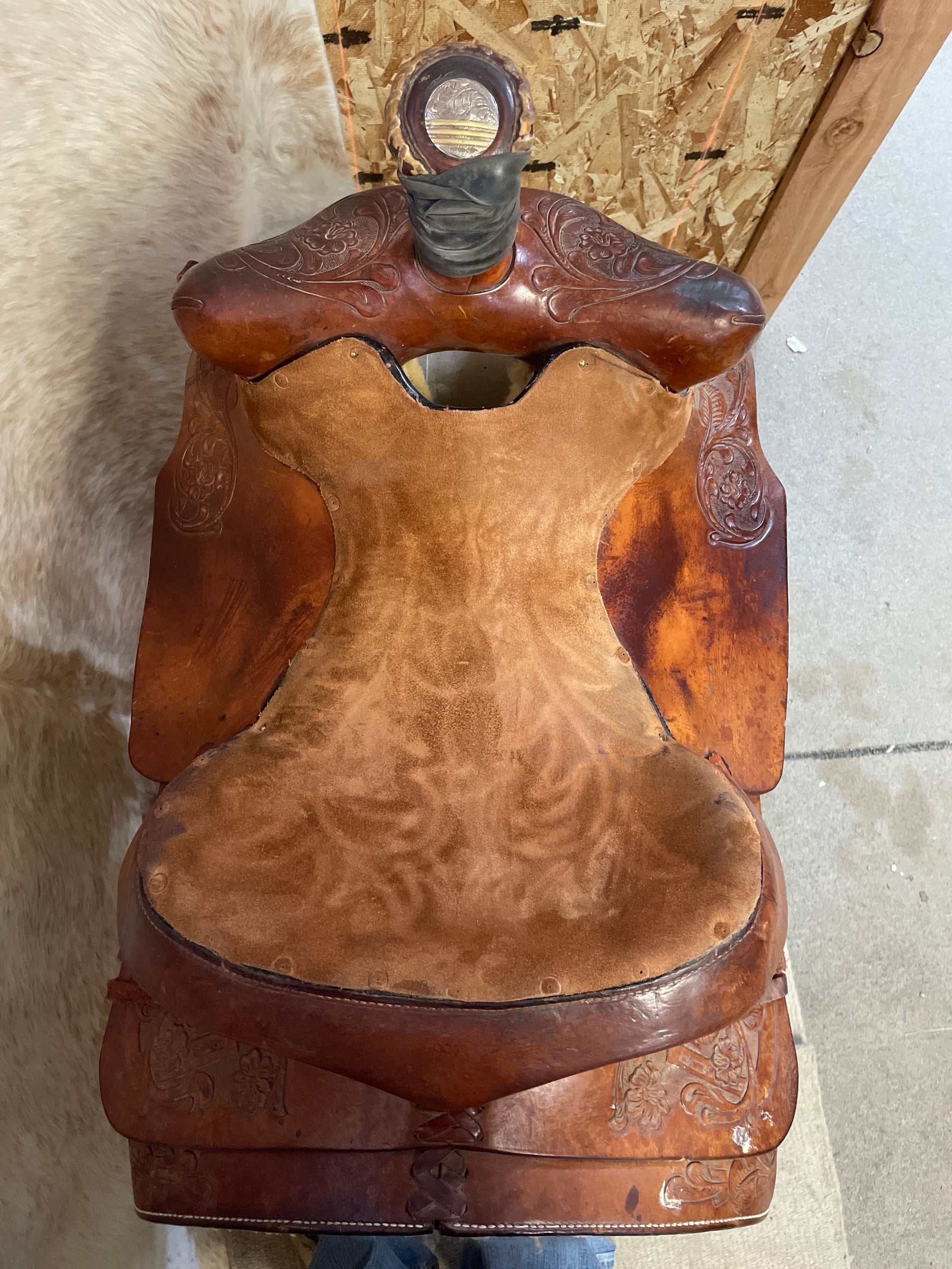 Spot Tooled Floral, Smoothout Leather, Rust Suede Seat (glued over smooth seat), Leather Covered Stirrups, Saddle Strings