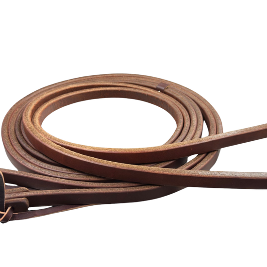 Invest in reins that won't let you down. These extra heavy harness split reins start with premium leather that's oil-infused, butter-conditioned, and hand-worked to deliver unmatched strength and feel. The traditional hand-rubbing process develops a warm golden chestnut patina that complements any saddle or equipment. Weighted ends sit perfectly in your palm for responsive control, while water loop closures with tie laces make switching reins effortless. Sized at 5/8" x 8', these reins are engineered for riders who expect their gear to match their commitment—built tough enough to handle years of serious work.