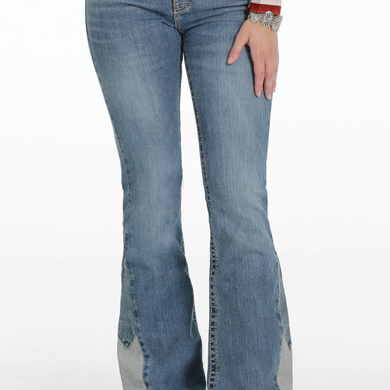 22" flare legs with reverse denim chevron shaped piecing give HANNAH an all-new, yet vintage look at the same time. Tint, hand sanding, whiskers, knee starbursts and a released bottom hem highlight an 11 oz. light stonewashed stretch denim.