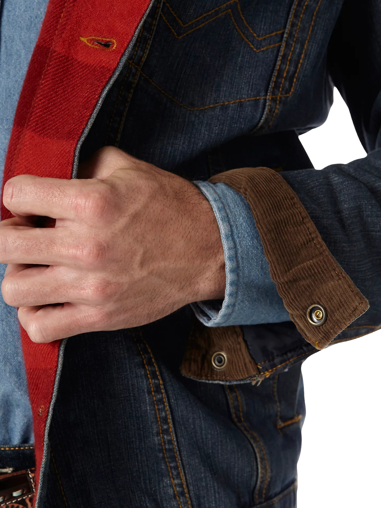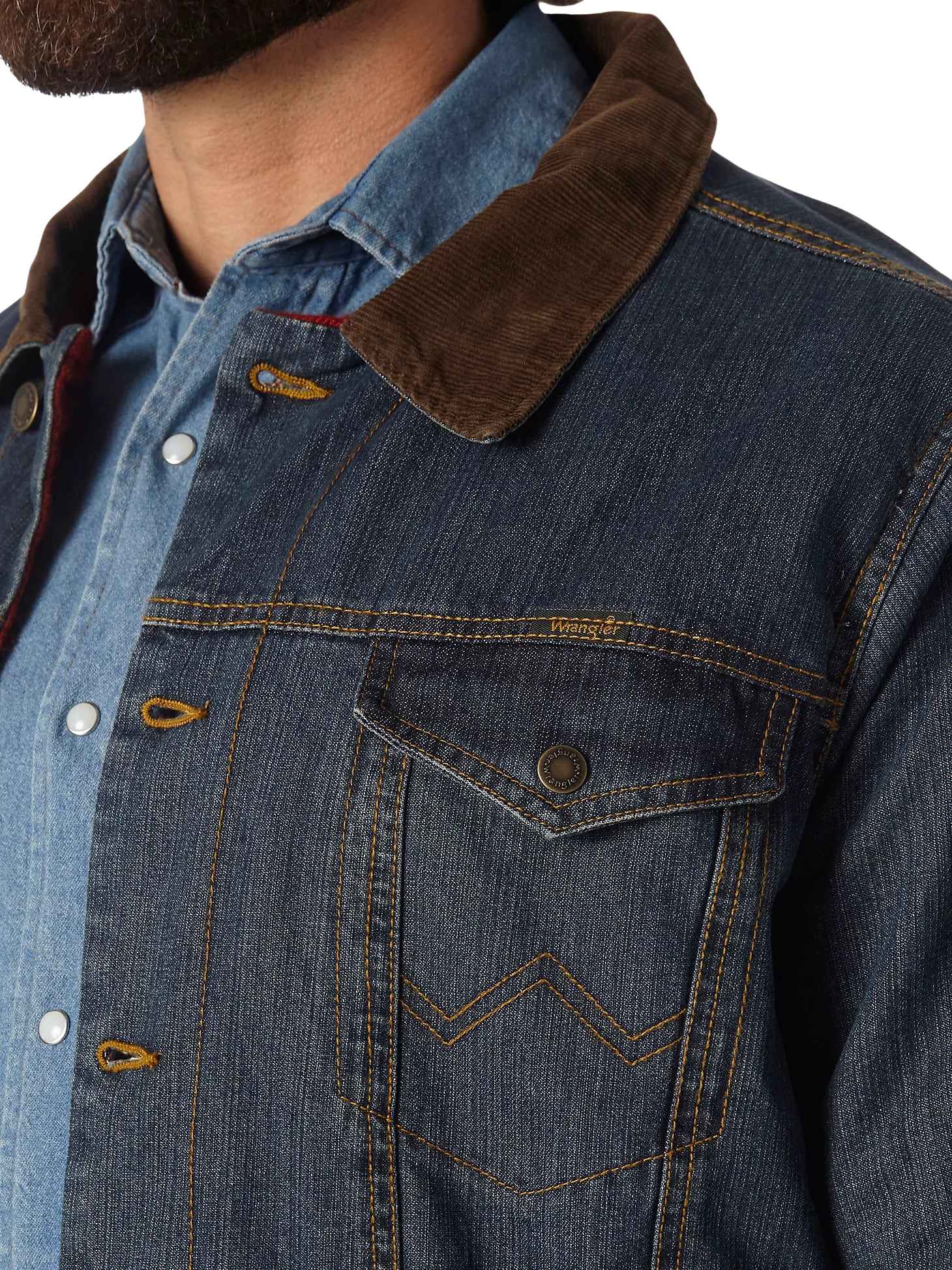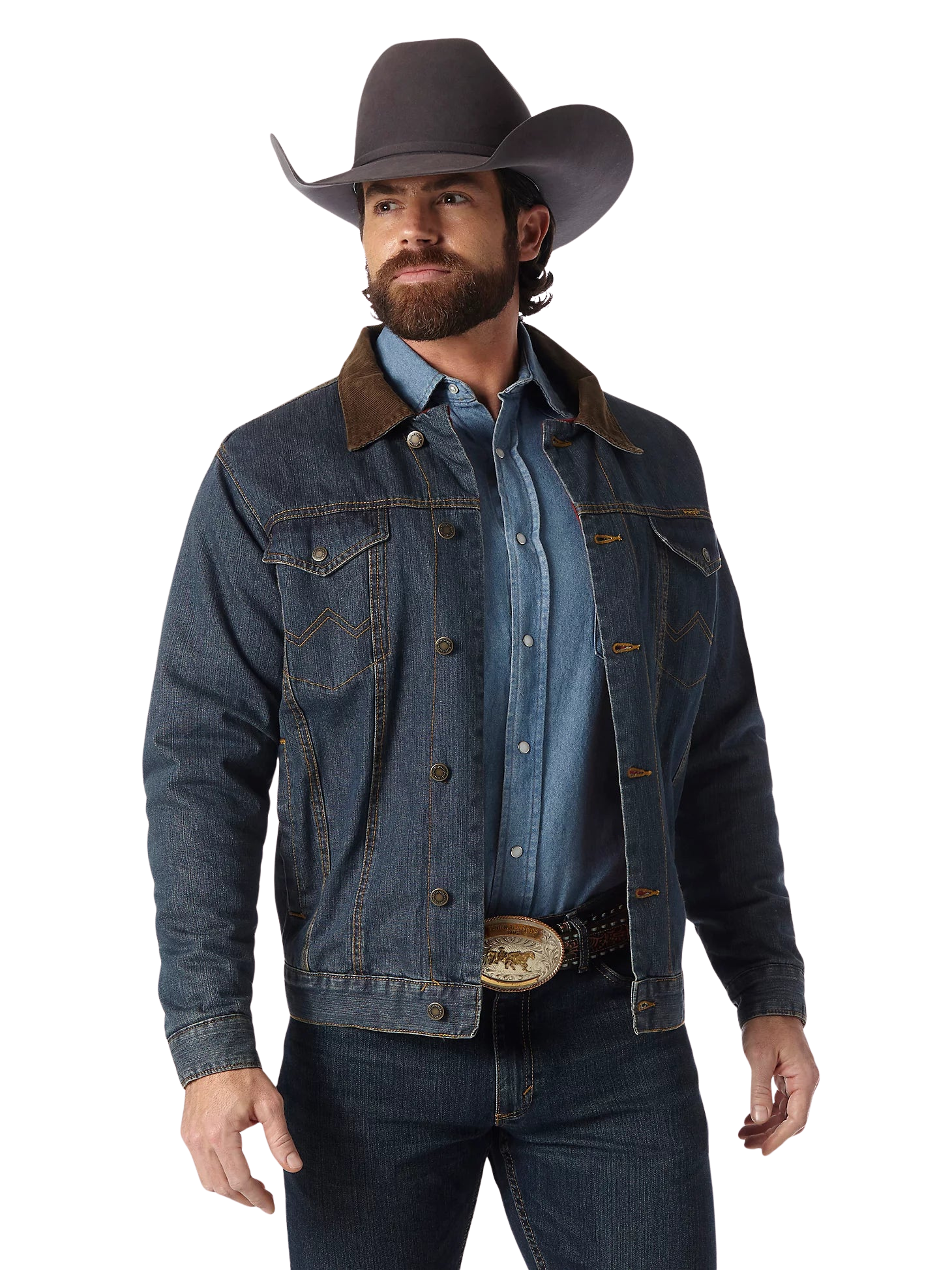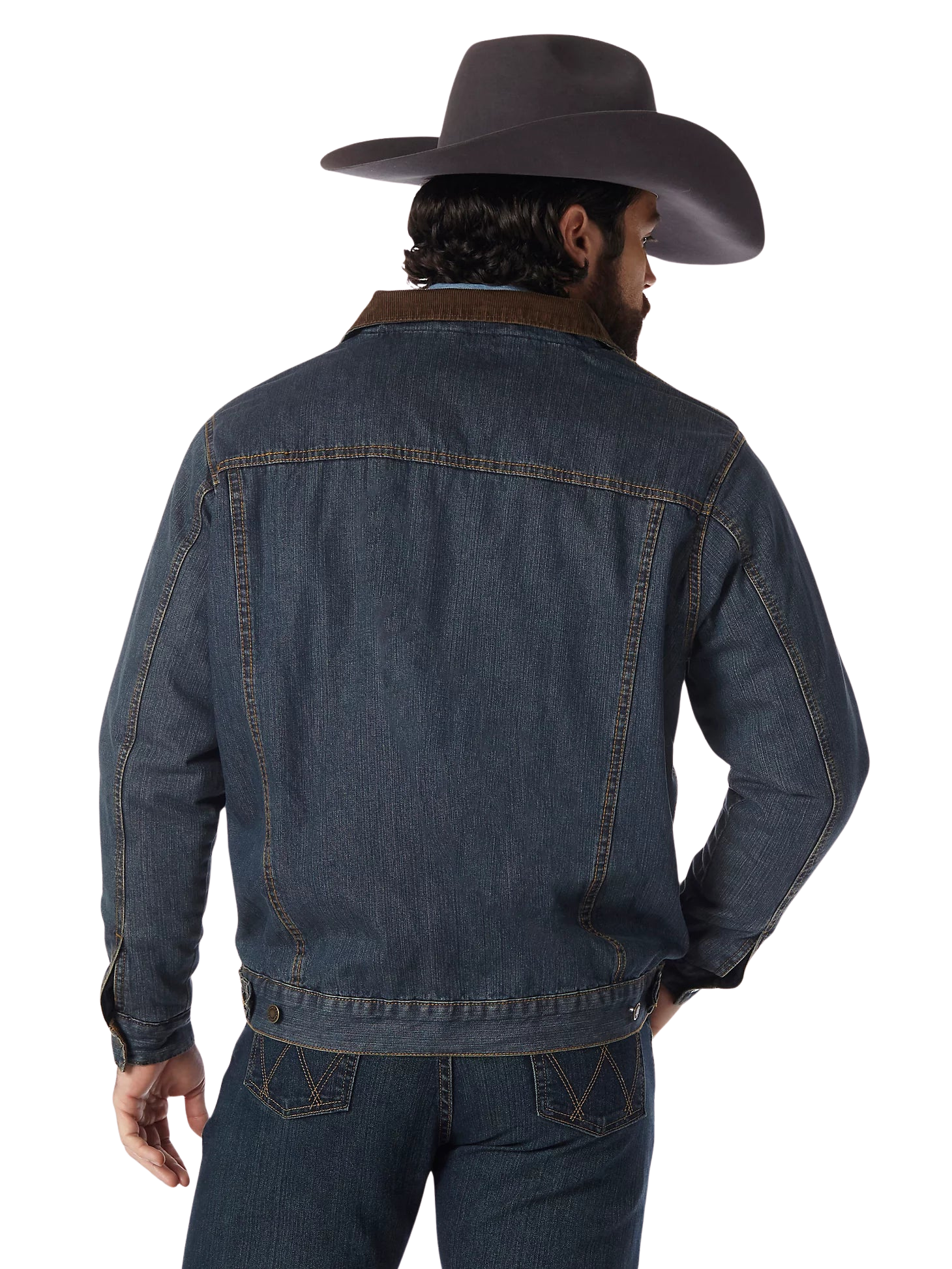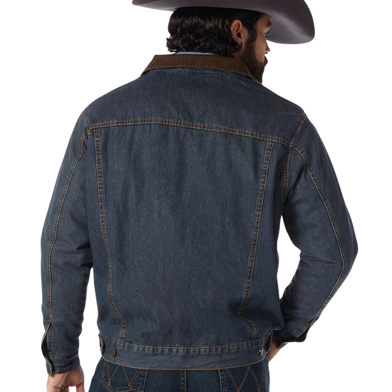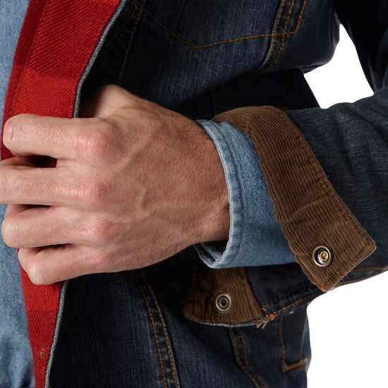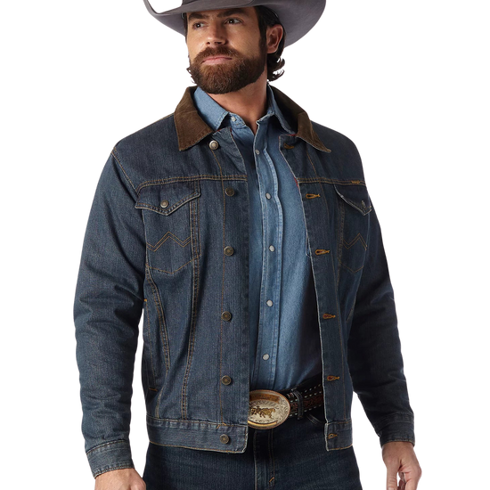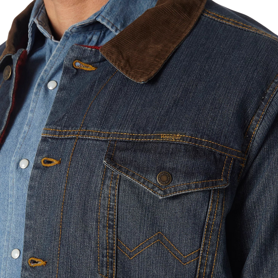 This transitional western styled jacket is both versatile and functional. Constructed in heavyweight, 14.75 oz. prewashed cotton denim and lined with warm and cozy blanket lining for durability and coziness. Features cool Wrangler® details like w stitching on the pockets and a Wrangler® logo. Fashions a stylish corduroy collar and lined cuffs, side pockets, front snap flap pockets, button front closure and adjustable buttons at the waist. Make this your everyday go to!