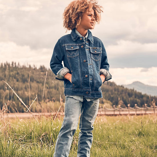 Now he can have his own iconic denim jacket just like his dad's. Cut with our iconic heavyweight broken twill denim and finished with chest snap flap pockets and a script logo riser label, it has all the elements of an authentic Wrangler jacket, but in a size that will fit your littlest cowboy.