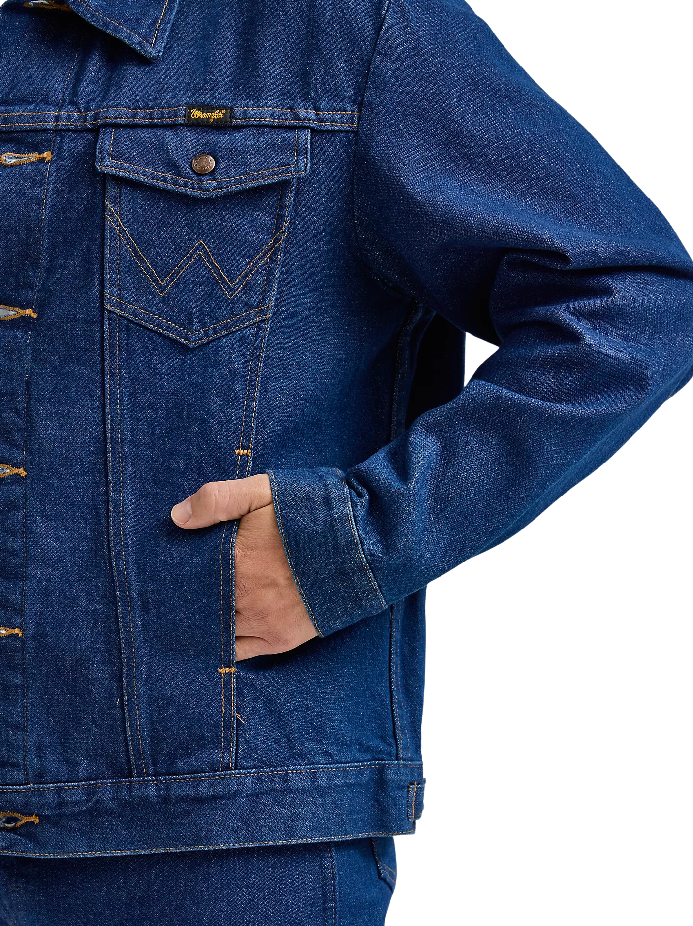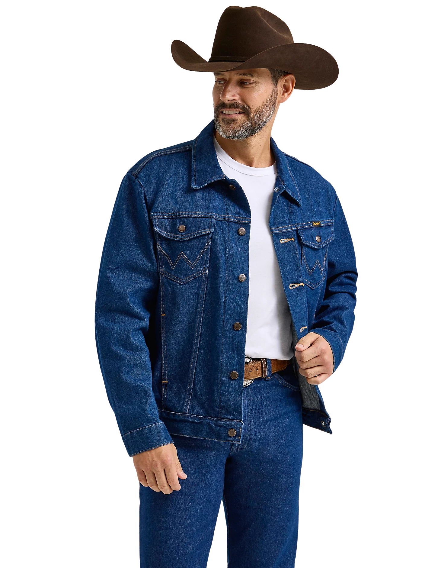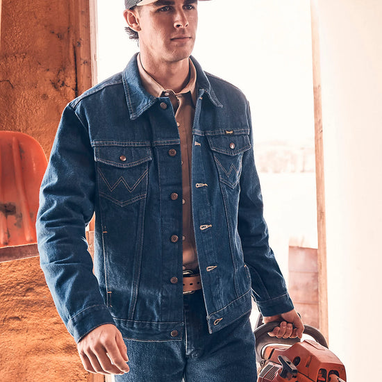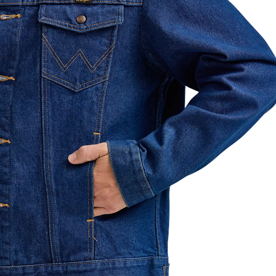 With all the same character and quality of an original, the Wrangler® Cowboy Cut® unlined denim jacket is as timeless as it gets. It's crafted from 100% cotton for a comfortable yet rigid fit that only gets better with time. Plus, it comes unlined to serve you well through every season. This classic denim jacket features all the iconic details you know and love—the chest pockets with flaps, snaps, and our signature 'W' embroidery, as well as lower pockets, a spread collar, and branded hardware. You'll want to wear it with anything and everything in your closet, but especially your favorite pair of Wrangler jeans.
