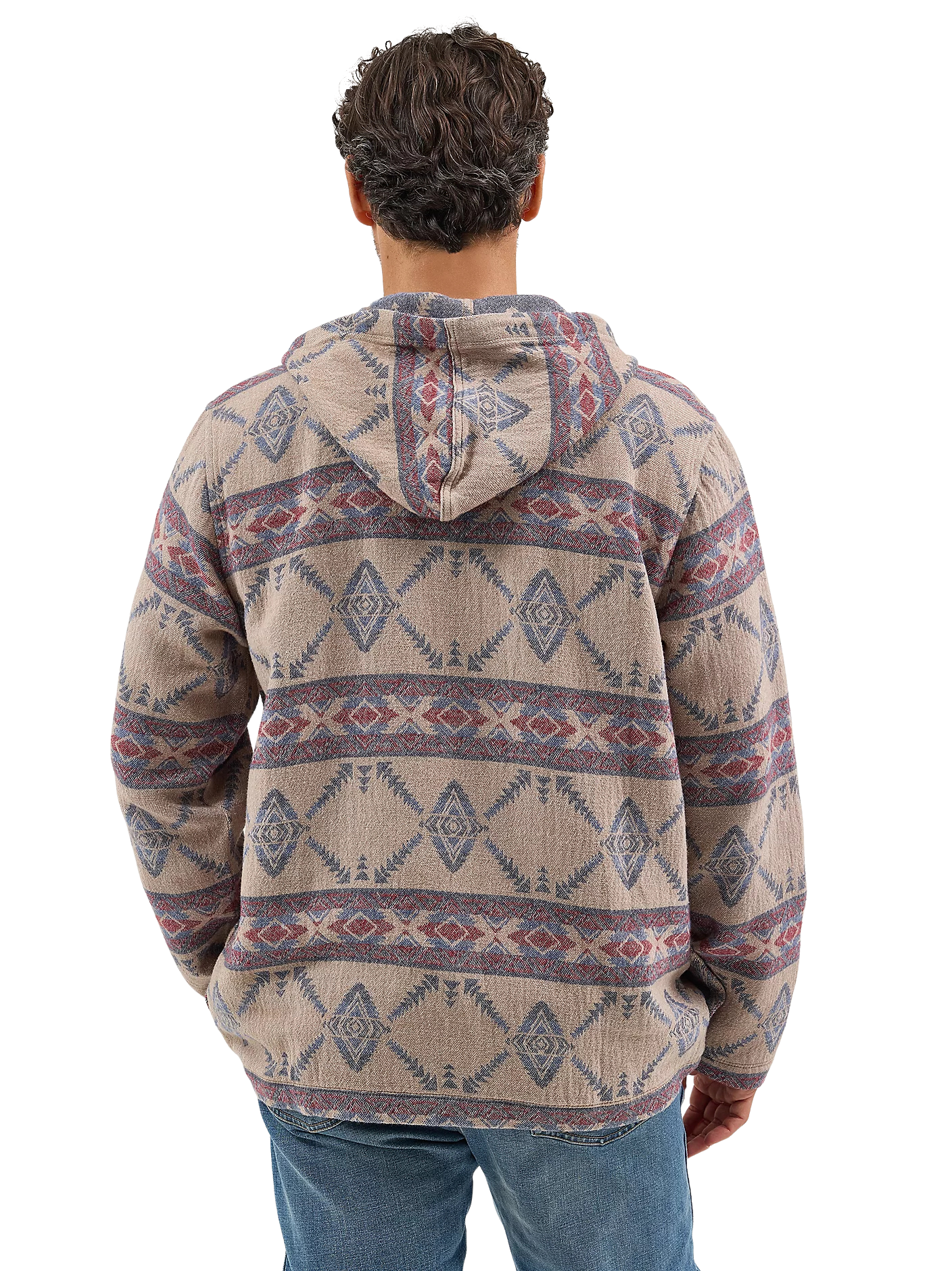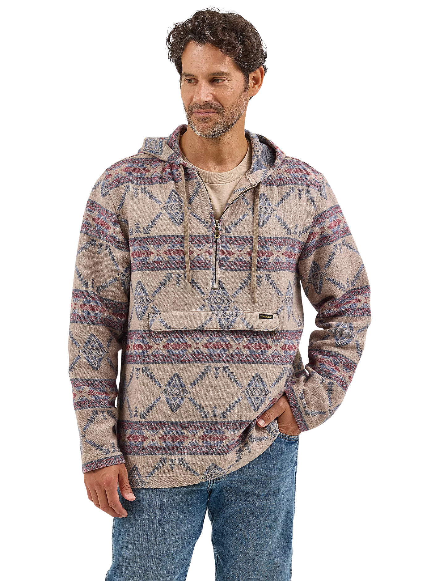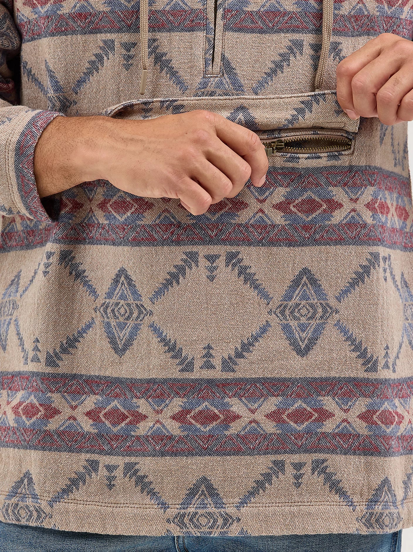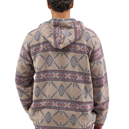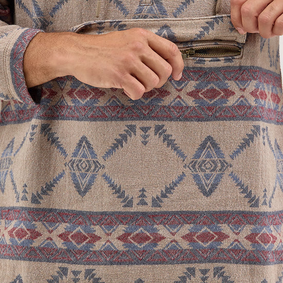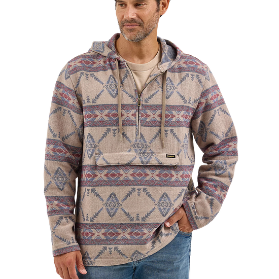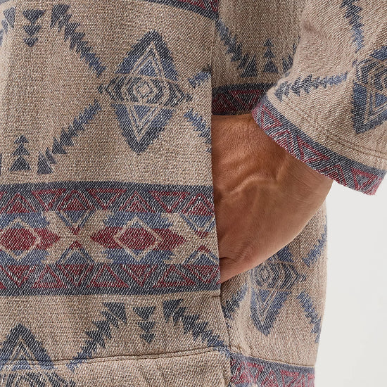 Layer up your look in style with our Men's Hooded Popover Jacket. Crafted from 100% cotton, this Western-inspired hoodie comes with a jacquard geometric design that will separate you from the pack. It also features a 1/4 zip front, a drawstring closure, welt hand pockets, and a pouch pocket that zips to keep your essentials secure.