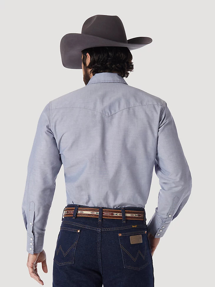 To tackle projects both on and off the job, you'll want a sturdy shirt that can handle everything you throw at it. Luckily, the Wrangler® Cowboy Cut® work shirt is a tried-and-true staple that performs from dawn until dusk. Our men's Cowboy Cut® rigid denim long sleeve shirt features a classic fit as well as a 100% cotton construction that's untouched, untreated, and unwashed. Plus, it comes with all the authentic Wrangler® details you know and trust, including Western front and back yokes, spade flap pockets with snap closures, and three-snap cuffs. Complete your look by pairing this Cowboy Cut® work Western rigid denim shirt with our Cowboy Cut® jeans. Long Live Cowboys®
