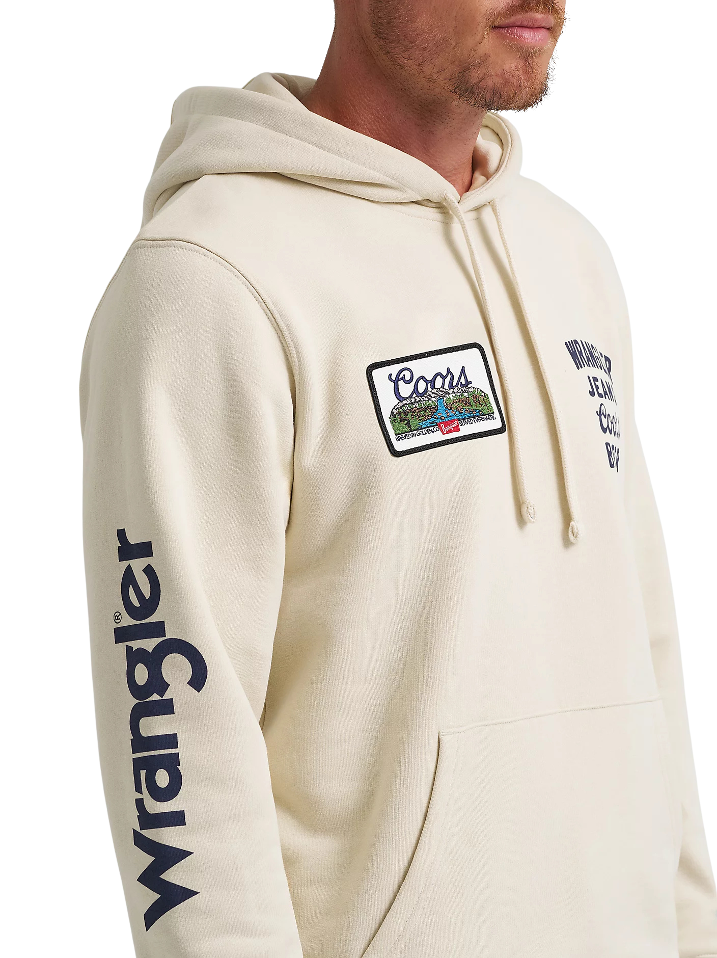 Stitched with heritage and grounded in the spirit of the West, this Wrangler® x Coors® Hoodie will keep you comfortable on every leg of the journey. It’s crafted from a warm cotton blend that won’t weigh you down. Down each sleeve, you’ll find the branding of your favorite names in beer and denim, along with a woven patch at the chest and co-branding from front to back. It comes with a regular cut that always fits just right, a drawstring at the neckline, and a kangaroo pocket.