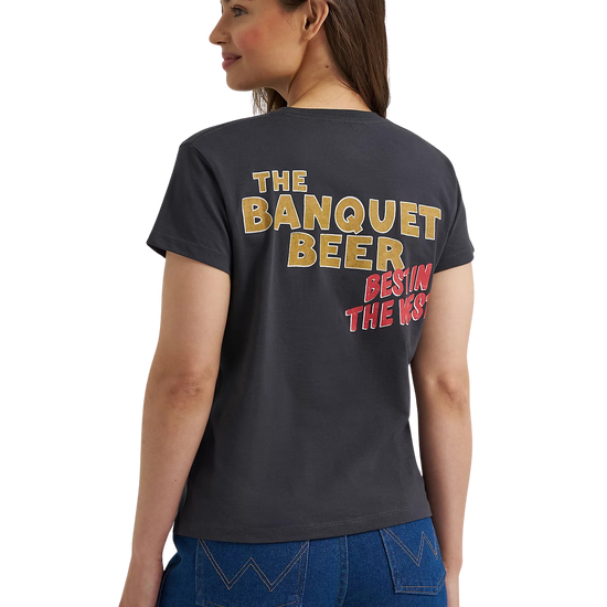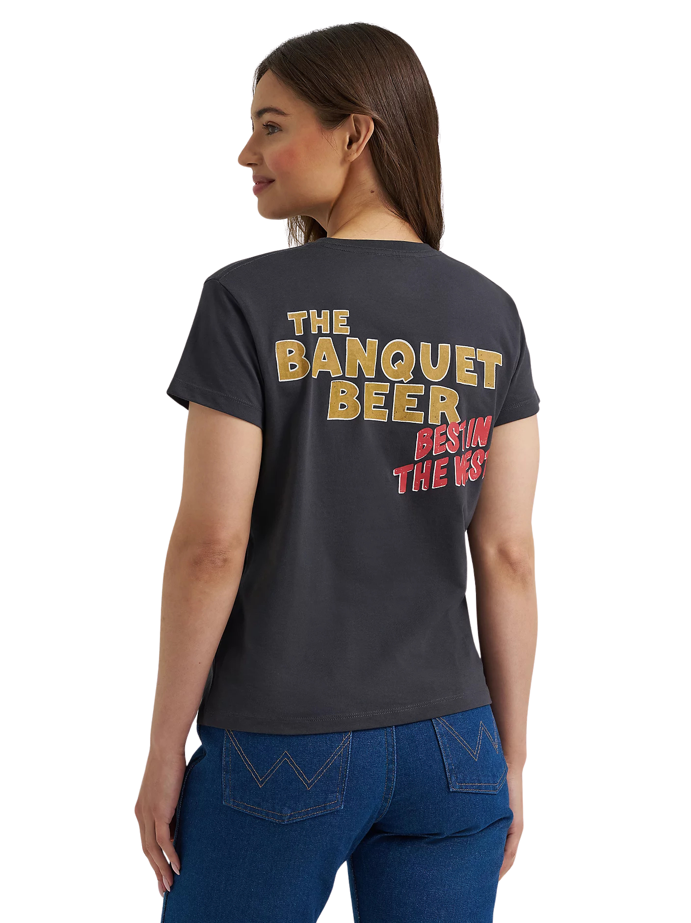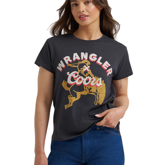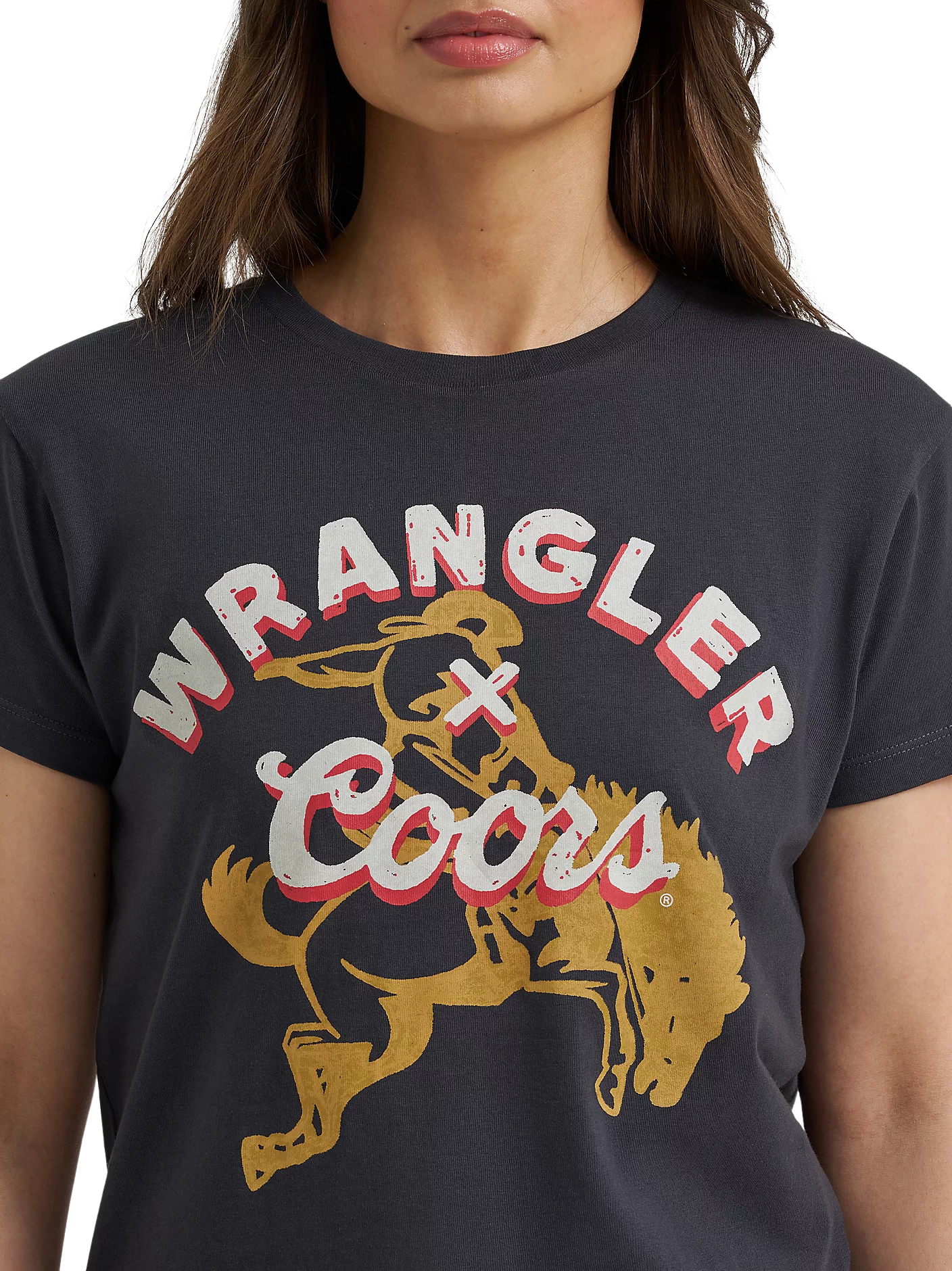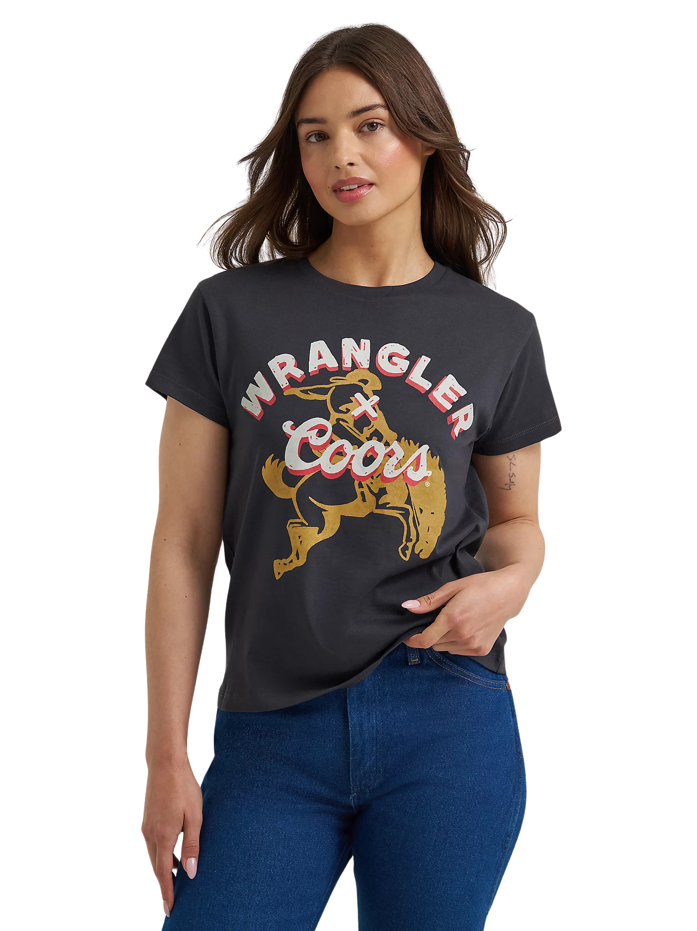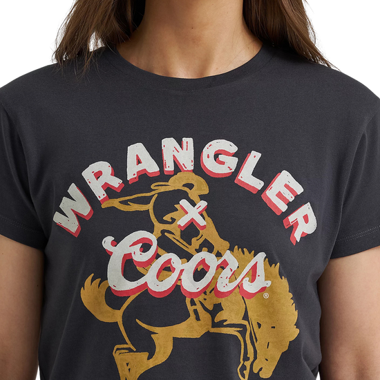 Two legends. One West. Wearing the Wrangler® x Coors® Women’s Banquet Tee, you’ll always be ready for the road ahead. It’s crafted from 100% cotton to keep you comfortable, with a classic crewneck style and a regular cut that always fits just right. It comes with co-branded graphics from front to back along with a bronc rider toasting to the Best in the West.