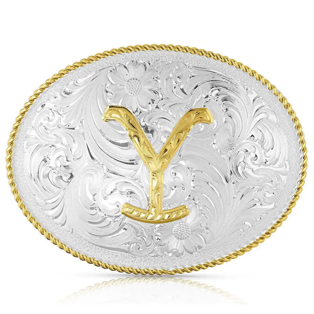 Inspired by the Yellowstone TV series this licensed buckle is based on the Dutton family ranch, the Yellowstone Dutton Ranch. Y figure buckle is a medium sized silver-finished oval shape belt buckle fully engraved in traditional, classic western bright cut scrolls. It is held by a twisted gold rope trim. It is engraved with a gold finished letter 'Y' in western style font of the Yellowstone Television show and applied to center. Standard 1.5 inch belt swivel.